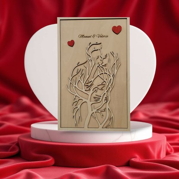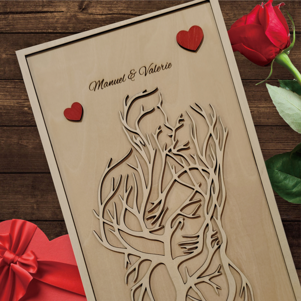 Offrez un cadeau unique et romantique avec notre cadre couple en bois contreplaqué tilleul. Découpé au laser avec précision, ce cadre met en valeur une magnifique illustration de couple enlacé, symbolisant l'amour et l'union.