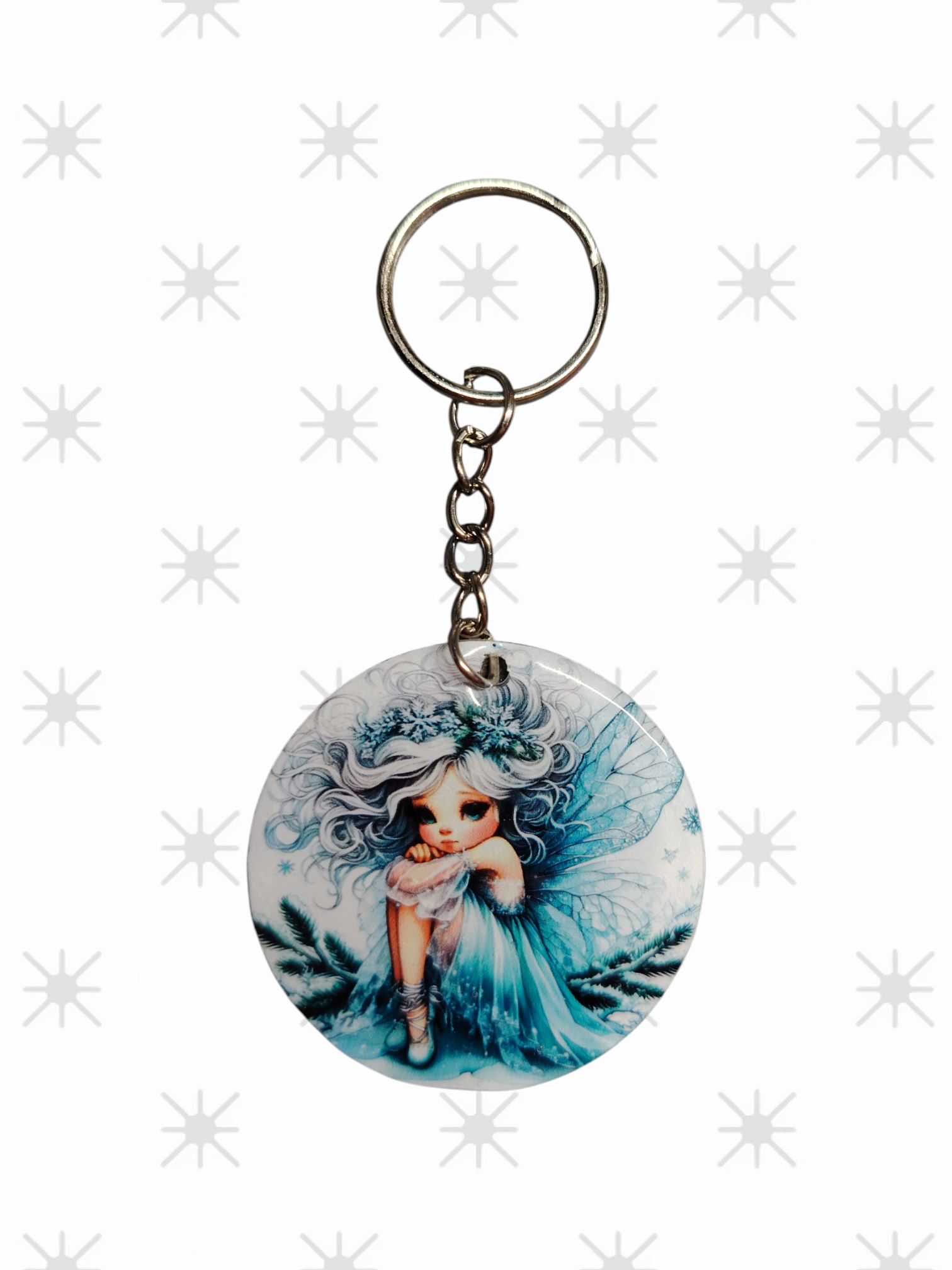 Porte-clé rond en acrylique avec illustration de fée bleue. Léger et résistant, parfait pour clés ou sacs.