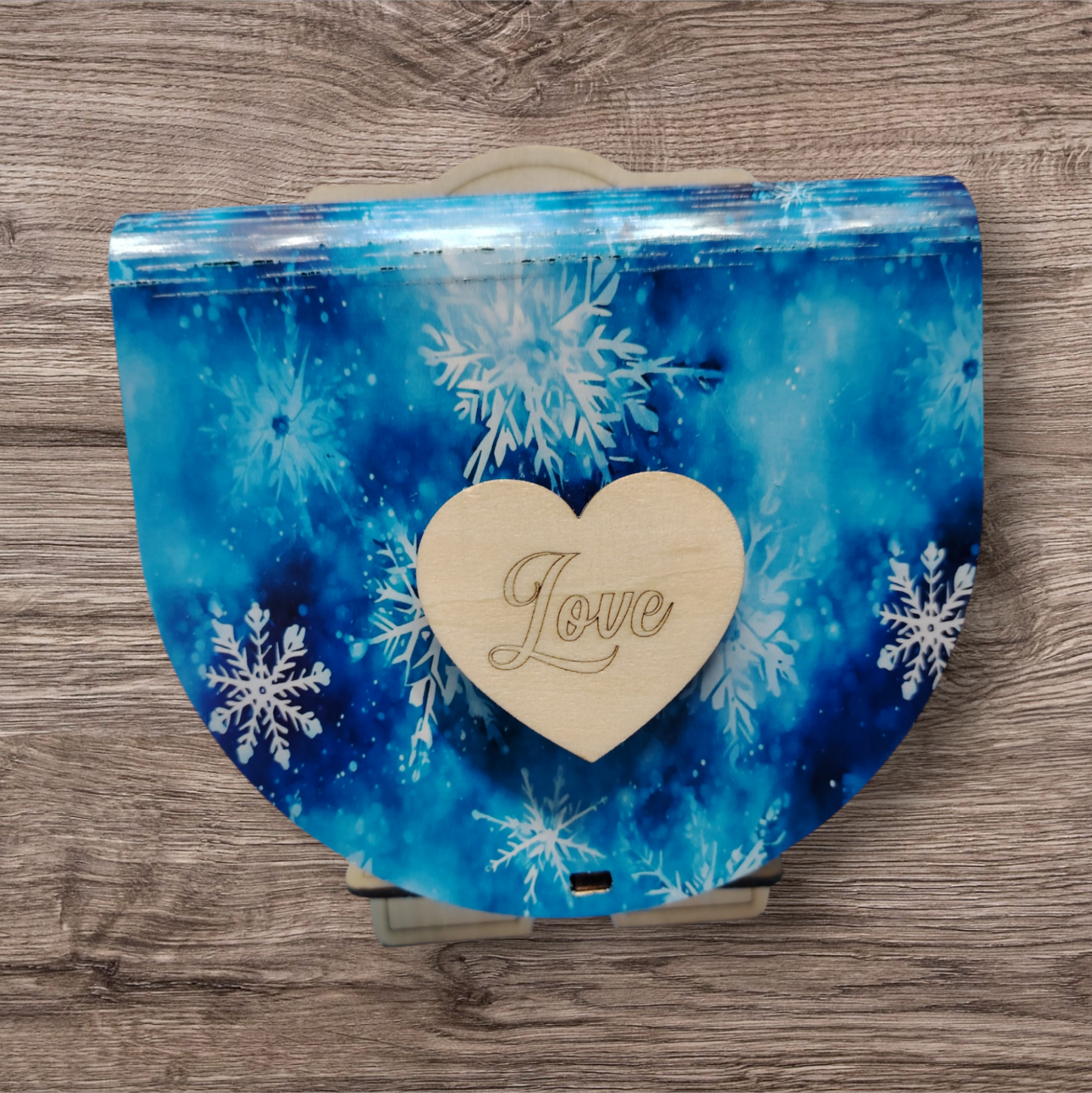 Boite à bijoux rondes en bois contreplaqué, découpée au laser et découpé au laser et décorée par impression DTF sur le couvercle. Finition soignée et effet décoratif hivernale.