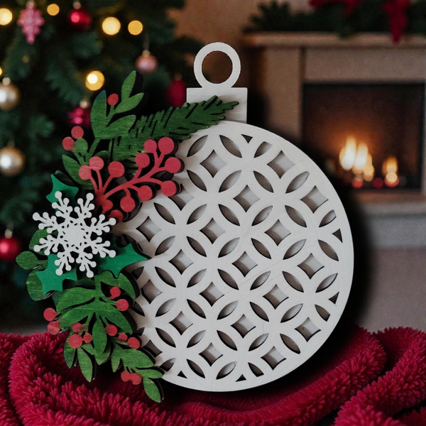 Boule de Noël mandala en bois contrplaqué, découpée au laser et peint à la main. Motif mandala élégant, finition soigniée et esprit festive.